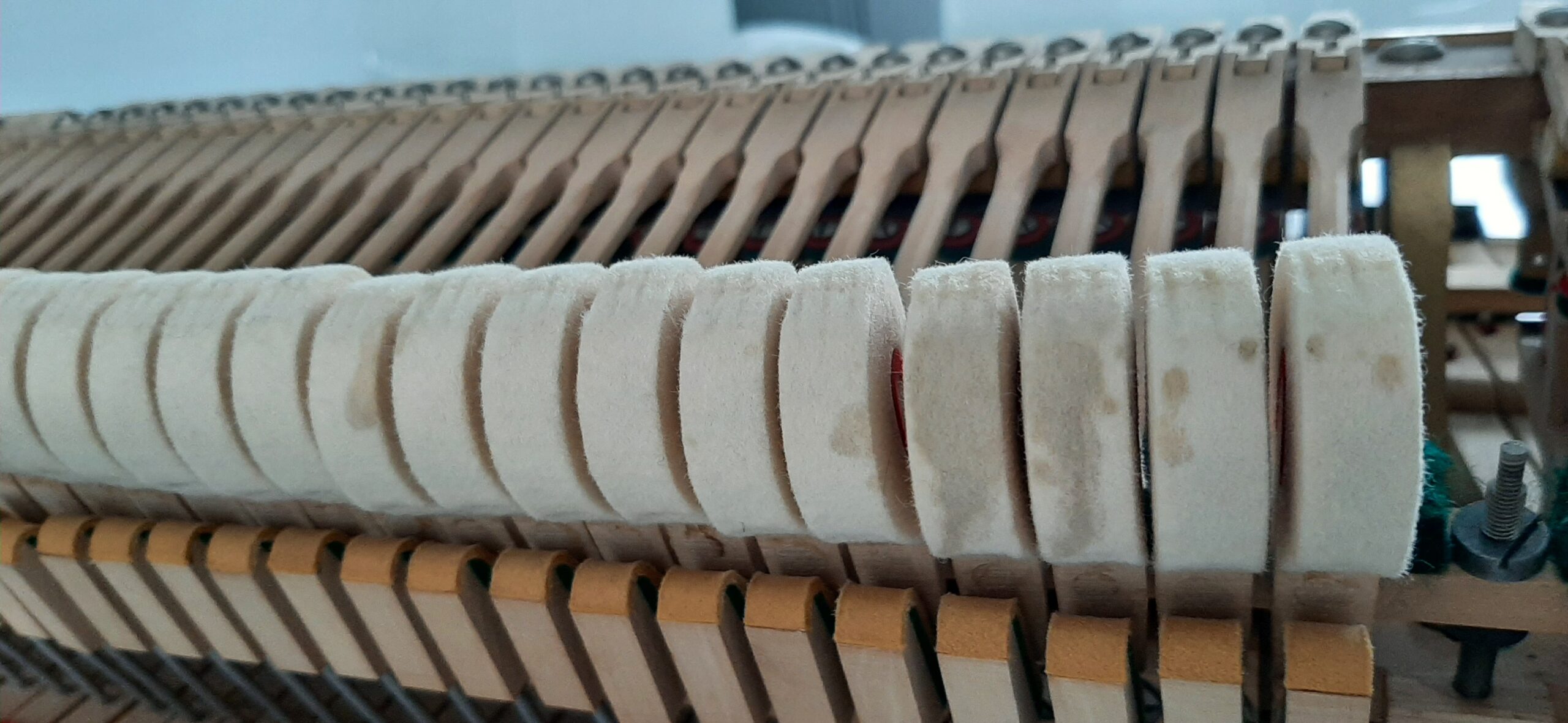Bij deze Schimmel vleugel werden alle klaviervilten en versleten hamer vervangen.