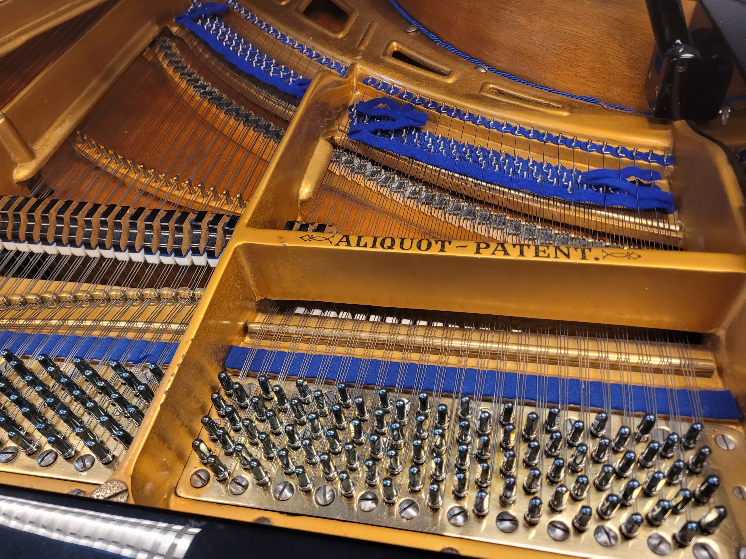 Het bijzondere van de Blúthner vleugel is toch de 4de snaar ookwel de Aliquot. Een extra resonerende snaar die net dat extra klankverschil maakt. Het opnieuw besnaren is altijd een heftige klus maar geeft zoveel voldoening. Ik mocht deze piano reviseren en tevens het meubel in zwart polyester uit laten voeren.